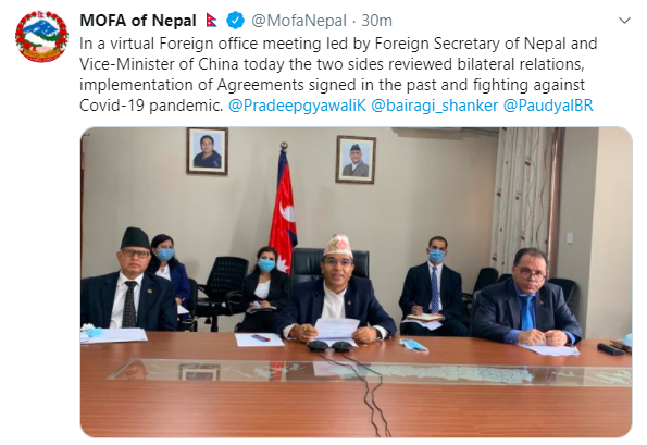 मन्त्रालयले नेपालका तर्फबाट परराष्ट्र सचिव शंकरदास वैरागी र चीनका तर्फबाट उपमन्त्रीको नेतृत्वमा छलफल भएको जानकारी दिएको छ । दुवै देशका अधिकारीबीच भएको छलफलमा कोरोना महामारी रोकथाम र नियन्त्रणका विषयलाई जोड दिइएको बताइएको छ ।
