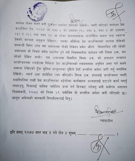 प्रेस काउन्सिल नेपालका कार्यवाहक अध्यक्ष किशोर श्रेष्ठका तर्फबाट सदस्य चेतनाथ धमलाले सर्वोच्च अदालतमा रिट दायर गरेका थिए ।