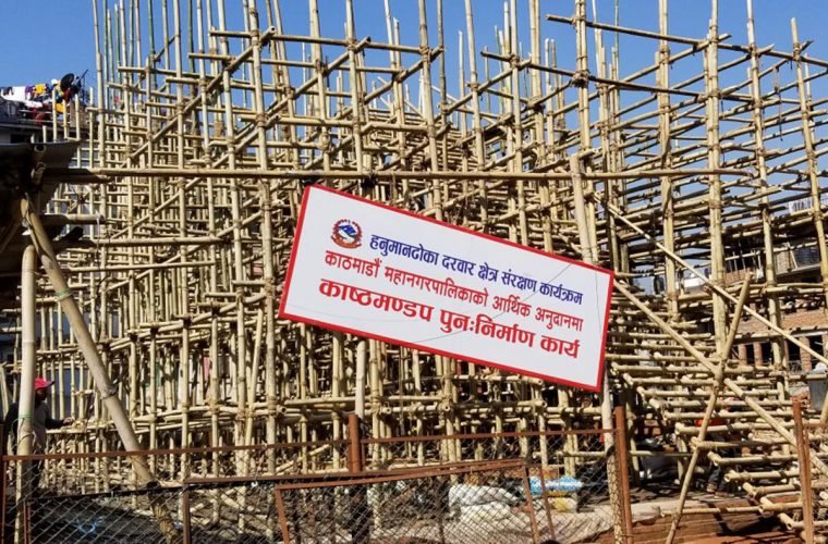 भूकम्पले पूर्णरुपमा क्षति पुर्याएपछि सातौँ शताब्दीको काष्ठमण्डप पुनःनिर्माणको काम अहिले तीव्ररुपमा भइरहेको हो । तत्कालीन राजा लक्ष्मीनरसिंह मल्लका पालामा एउटै रुखबाट काष्ठमण्डप निर्माण गरेको इतिहास छ । निर्माणका क्रममा अहिले प्रयोग गरिएका केही काठ पुरानै र केही टिम्बर कर्पोरेशन अफ नेपालसँग लिखित सम्झौता गरी ल्याइएको हो । अहिले छानामा प्रयोग हुने काठको आवश्यकता परेकाले धनगढीबाट ल्याउने तयारी भएको अध्यक्ष शाक्यले जानकारी दिए ।