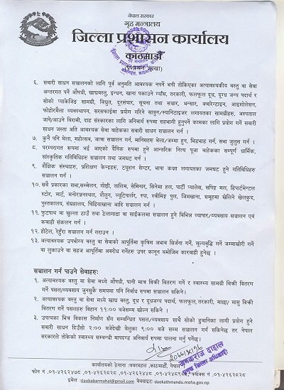 तोकिएको र अत्यावश्यक सेवा तथा वस्तु बाहेकका अन्य सबै प्रकारका व्यापार, व्यवसाय सञ्चालन गर्न पाइने छैन । अत्यावश्यक सामग्री लगायत मालवाहक ढुवानीका सवारी साधन, स्वास्थ्यकर्मी तथा सुरक्षा निकायले प्रयोग गर्ने सवारीबाहेक काठमाडौँ उपत्यकाभित्र सवारी प्रवेशमा समेत निषेध गरिएको छ । यसरी आएका सवारकिा चालक सहचालक अनिवार्य रुपमा क्वारेन्टिनमा बस्नुपर्नेछ ।