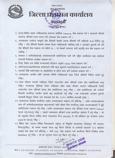 शैक्षिक संस्थाहरु, प्रशिक्षण केन्द्रहरु, ट्युसन सेन्टर, भाषा कक्षालगायत जमघट हुने गतिविधिसमेत सञ्चालन गर्न पाइँदैन । फुटपाथ वा खुला ठाउँमा र ठेलागाडा वा साइकलमा सञ्चालन हुने व्यवसाय तथा कवाडी सङ्कलन, होटल रेष्टुराँ सञ्चालन गर्न पाउनेछैन । अत्यावश्यक कामका लागि घरबाहिर निस्कनु परेमा अनिवार्य रुपमा मास्कको प्रयोग र न्यूनतम भौतिक दूरी कायम गर्नुपर्ने छ । अत्यावश्यक उपभोग्य वस्तु वा सेवाको आपूर्तिमा कृत्रिम अभाव सिर्जना गर्ने, मूल्यवृद्धि गर्ने, जम्माखोरी गर्ने वा लुकाउने वा सहज आपूर्तिमा अवरोध गर्नेहरु उपर कडा कारवाही गरिने जनाइएको छ ।