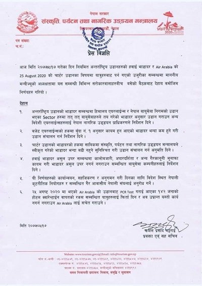 यी निर्णयहरुको कार्यान्वयन, सहजिकरण र अनुगमन गरी दिनका लागि विदेश स्थित नेपाली कुटनीतिक नियोगहरु र सम्बन्धित गैर आवासीय नेपाली संघलाई अनुरोध गरिने मन्त्रालयले जनाएको छ । अगष्ट २६ मा भएको एयर अरेबियाको उडानबाट पिसीआर परीक्षण गराइए आएका १४२ जनाको होटल क्वारेन्टिन वापतको रकम सम्बन्धित यात्रुलाई फिर्ता दिन र अब उप्रान्त यस्तो कार्य नगर्न नगराउन सचेतना गराउने निर्णय भएको विज्ञप्तिमा उल्लेख छ ।