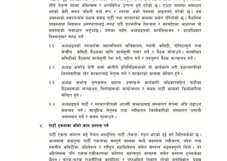 त्यस्तै अध्यक्षद्वय ले स्थायी कमिटीको पाँचौं बैठकलाई समाधानको विन्दु मानेर विवादमा नफर्कने अठोटसमेत गरेका हुन् । पाँचौं स्थायी कमिटी बैठकको निर्णय सार्वजनिक गर्दै अध्यक्षद्वय ओली र प्रचण्डले तहगत कमिटीहरूमा राजनीतिक दलसम्बन्धी विद्यमान कानुन परिपालना गर्ने उद्घोष गरेका हुन् ।