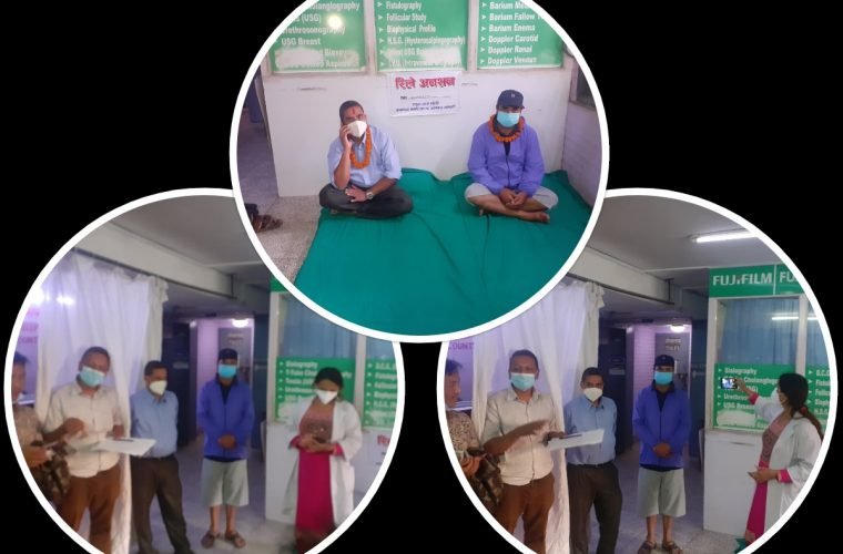 तलबको माग गर्दै अस्पतालको प्रांगणमा कर्मचारीहरूले रिले अनसन सुरु गरेका छन् । अस्पताल प्रशासनले तलब नदिएसम्म आन्दोलन नरोक्ने आन्दोलनकारी कर्मचारीले बताएका छन् ।