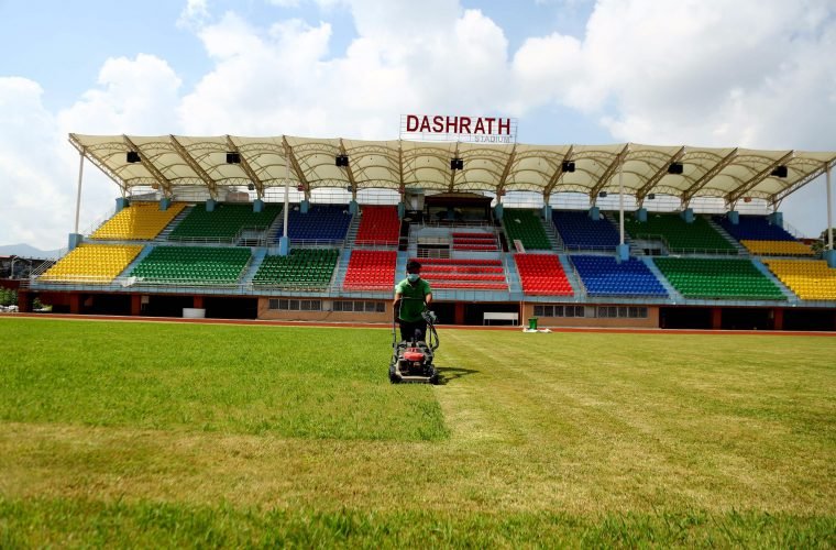 त्रिपुरेश्वरको दशरथ रङ्गशाला मैदानमा मङ्गलबार मिसिनले घाँस काटिँदै । कोराना भाइरस नियन्त्रण तथा रोकथामका लागि प्रशासनले लगाएको बन्दाबन्दी र निषेधाज्ञामा पनि सुरक्षाका मापदण्ड पालना गरेर रङ्गशाला मर्मत सम्भार भएको छ ।