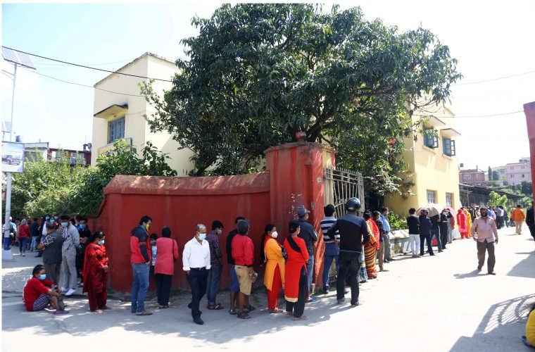 थापाथलीस्थित खाद्य व्यवस्थापन तथा बजार कम्पनीमा मङ्गलबार प्याज किन्न लाइन लागेर बसेका उपभोक्ता । कम्पनीले प्याज प्रतिकिलो ६० मा बिक्री गरेको छ ।