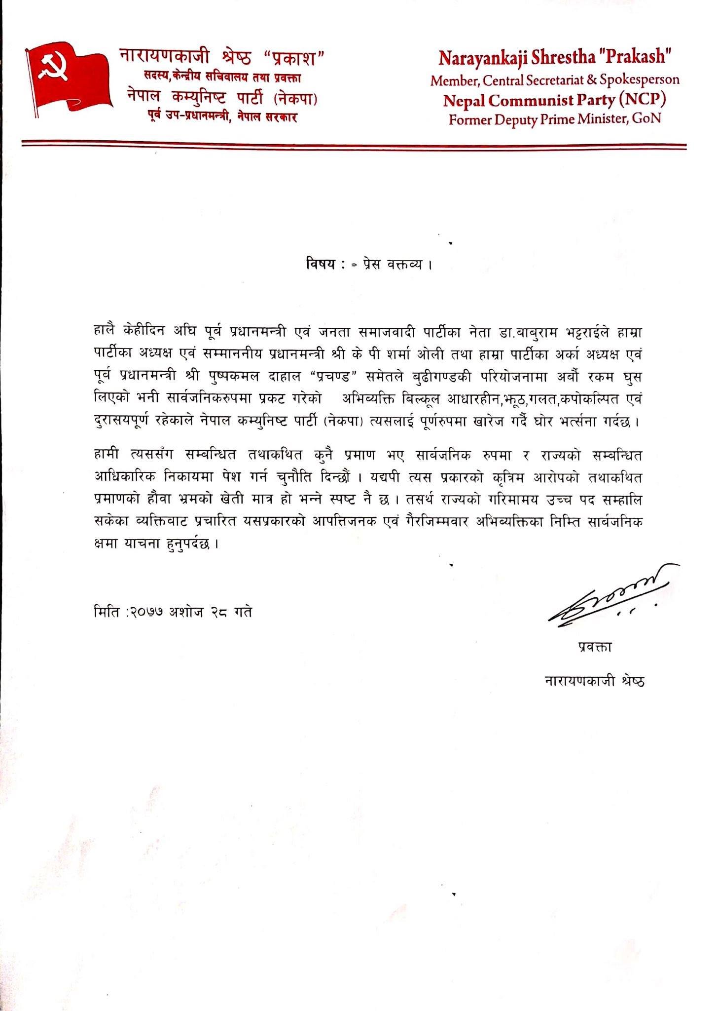 भट्टराईले बूढीगण्डकी परियोजनामा अर्बौं रकम घुस लिएको भनी सार्वजनिक रुपमा दिएको अभिव्यक्ति बिलकुल आधारहीन, झूट, गलत, कपोकल्पित र दुर्भाग्यपूर्ण रहेको विज्ञप्तिमा उल्लेख छ । यसअघि कांग्रेसले पनि भट्टराईलाई आरोप पुष्टि गर्न चुनौती दिएको थियो ।