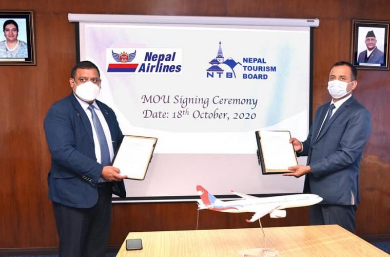 काठमाडौं । नेपाल पर्यटन बोर्ड र नेपाल वायुसेवा निगमबीच नेपालको पर्यटन प्रबद्र्धनका विभिन्न पक्षहरूका सम्बन्धमा सहकार्य गर्ने गरी सम्झौता भएको छ । सम्झौतापत्रमा आइतबार नेपाल पर्यटन बोर्डका तर्फबाट कार्यकारी प्रमुख डा. धनञ्जय रेग्मी र नेपाल वायुसेवा निगम महाप्रबन्धक डीमप्रसाद पौडेलले हस्ताक्षर गरेका छन् ।