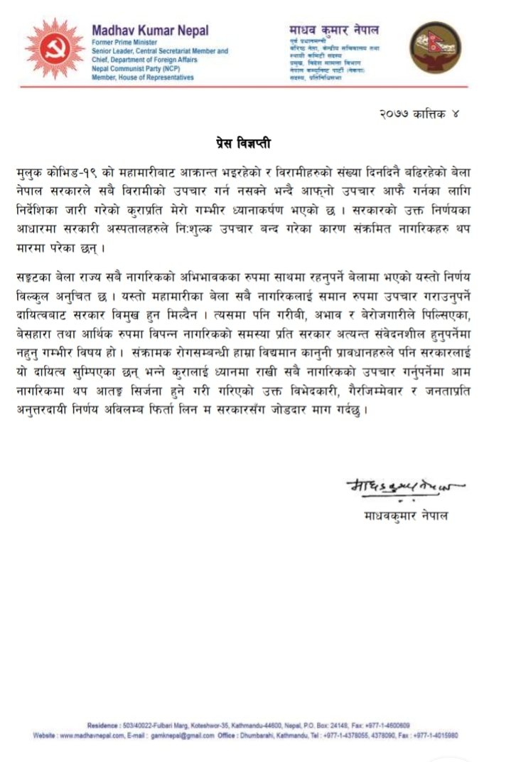 कोरोना संक्रमितको निःशुल्क उपचार नगर्ने निर्णय फिर्ता लिन सरकारलाई माधव नेपालको आग्रह