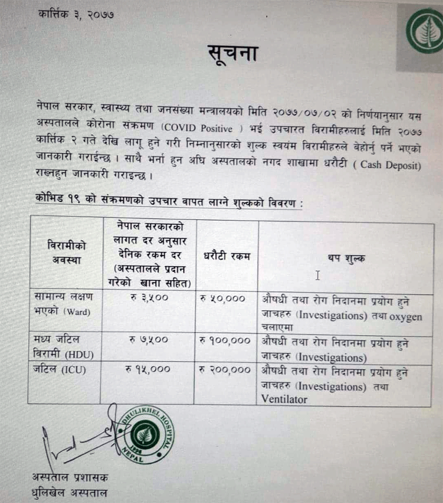 काठमाडौं । काभ्रेको धुलिखेलस्थित धुलिखेल अस्पतालले कोरोना भाइरस संक्रमण भई उपचाररत बिरामीलाई भर्ना हुनुअघि २ लाख रुपैयाँसम्म नगद धरौटी राख्न सूचना जारी गरेको छ ।