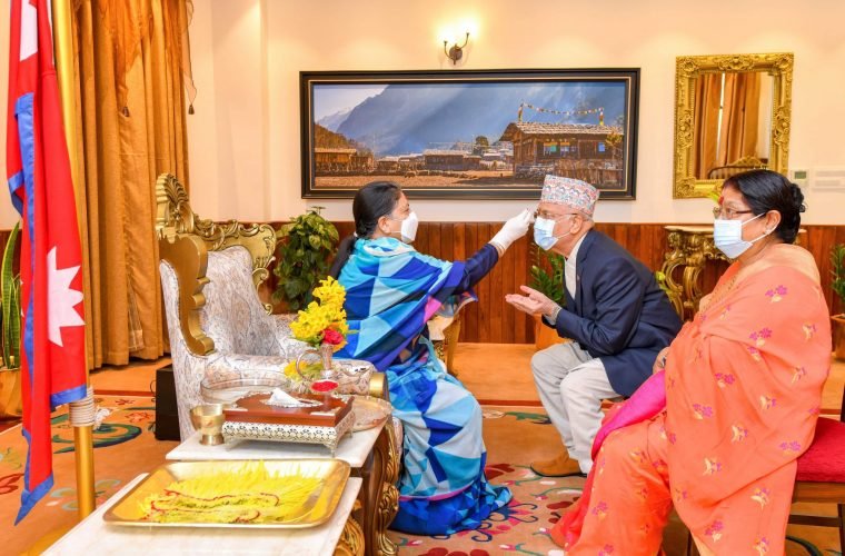 प्रधानमन्त्री ओलीका साथ धर्मपत्नी राधिका शाक्यले पनि राष्ट्रपति भण्डारीबाट टीका तथा जमरा ग्रहण गरेकी थिइन् ।