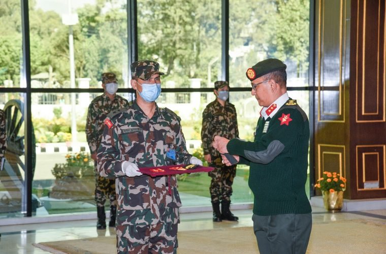 काठमाडौं । प्रधानसेनापति पूर्णचन्द्र थापाले हालै पदोन्नति भएका ईश्वर हमाललाई रथी दर्जाको दज्र्यानी चिह्न प्रदान गरेका छन् ।