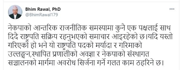 शुक्रबार सामाजिक संजाल ट्वीटमार्फत रावलले नेकपाका राजनीतिक सस्या समाधानका सन्दर्भमा एक पक्षलाई साथ दिएको हो भने यो राष्ट्रपति पदको मर्यादा र गरिमाको उल्लङ्घन,स्थापित प्रणालीको अवज्ञा र नेकपाको संस्थागत सञ्चालनको मार्गमा अवरोध सिर्जना गर्ने गलत काम ठहरिने उल्लेख गरेका छन् ।