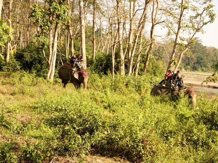 चितवन राष्ट्रिय निकुञ्जअन्तरगत बाघमारा मध्यवर्ती सामुदायिक वनमा हात्ती सफारी गर्दै पर्यटक । यहाँ हात्ती सफारी गरेर एक सिंङ्गे गैँडालगायत दुर्लभ वन्यजन्तु अवलोकनमा पर्यटक लालायित हुन्छन् । कोरोनाको कहरका बीच सुरक्षा मापदण्ड अपनाएर दशैँबाट भने यहाँ पर्यटकीय चहलपहल शुरु भगरिएको छ । तस्वीरः नारायण ढुङ्गाना, रासस