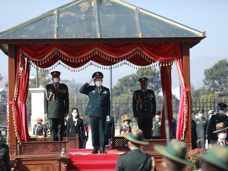 काठमाडौं । नेपाल भ्रमणमा रहेका चीनका रक्षामन्त्री वेइ फेङ्हे नेपाली सेनाको जंगी अड्डा निरीक्षणका लागि पुगेका छन् । भद्रकालीस्थित जंगीअड्डामा नेपाली सेनाको एक टोलीले उनलाई सम्मान गारद अर्पण गरेको थियो ।