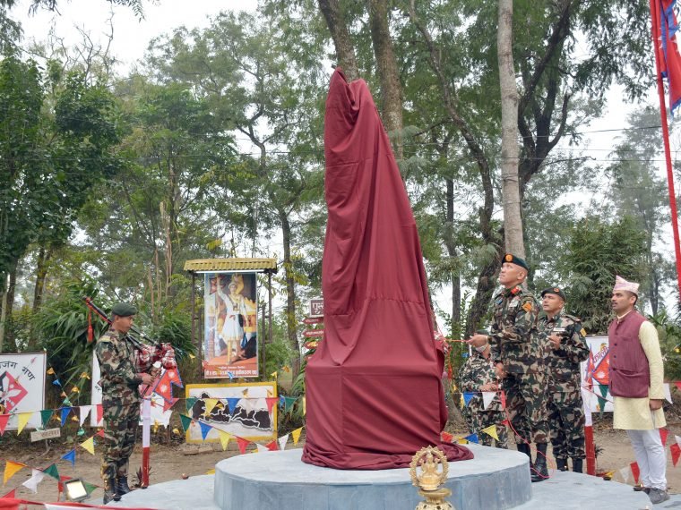 दमौली । नेपाली सेनाको खैरेनीटारस्थित श्री नम्बर ३ बाहिनीमा पृथ्वीनारायण शाहको पूर्णकदको शालिक अनावरण गरिएको छ । नेपाली सेनाका संस्थापक एवं राष्ट्रनिर्माता पृथ्वीनारायण शाहको सम्मानमा बाहिनीभित्र निर्माण गरिएको शालिकको शनिबार अनावरण गरिएको हो ।