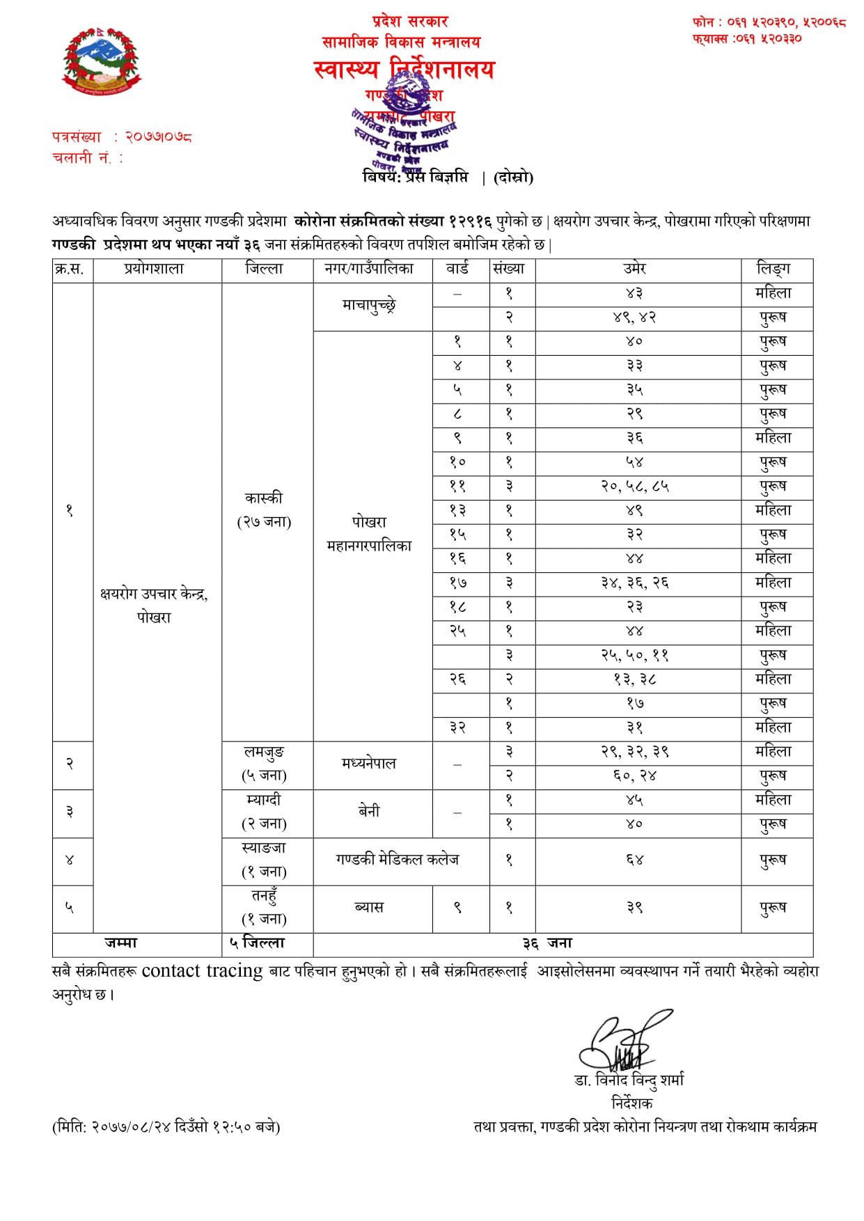 गण्डकी प्रदेशमा थप ३६ जनामा कोरोना संक्रमण