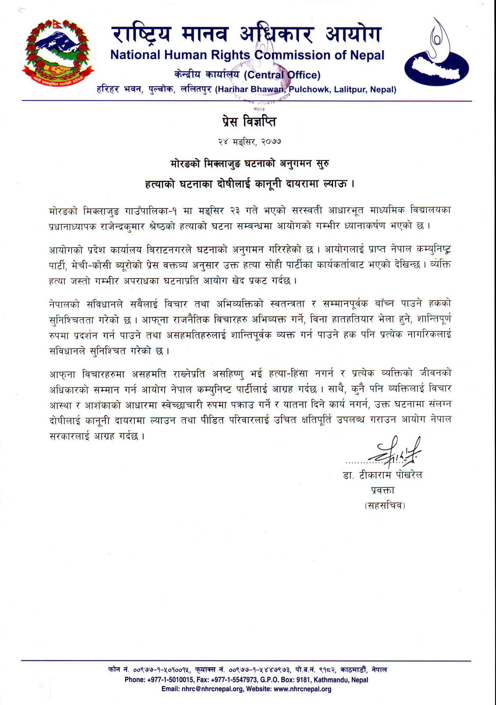 त्यस्तै पीडित परिवारलाई उचित क्षतिपूर्ति उपलब्ध गराउन पनि आयोगले सरकारलाई आग्रह गरेको छ । मंगलबार विहान मोरङ मिक्लाजुङ–१ को सरस्वती माध्यमिक विद्यालयका प्रधानाध्यापक राजेन्द्रकुमार श्रेष्ठको हत्या भएको थियो । हत्याको नेकपाले जिम्मेवारी लिएको छ । उसले आफूहरुविरुद्ध श्रेष्ठले सुराकी गरेका र आफ्ना कार्यकर्तामाथि जाइलागेकाले प्रतिकार गर्दा मृत्यु भएको जनाएको छ ।
