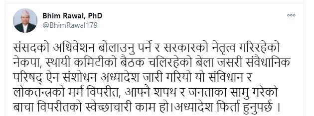 नेकपाका नेता डा. भीम रावलले लेखेका छन्,‘संसदको अधिवेशन बोलाउनु पर्ने र सरकारको नेतृत्व गरिरहेको नेकपा, स्थायी कमिटीको बैठक चलिरहेको बेला जसरी संवैधानिक परिषद् ऐन संशोधन अध्यादेश जारी गरियो यो संविधान र लोकतन्त्रको मर्म विपरीत, आफ्नै शपथ र जनताका सामु गरेको बाचा विपरीतको स्वेच्छाचारी काम हो । अध्यादेश फिर्ता हुनुपर्छ ।’
