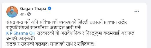 नेपाली कांग्रेसका नेता गगन थापाले सामाजिक संजालमा लेखेका छन्, ‘संसद बन्द गर्ने अनि संविधानको व्यवस्थाको खिल्ली उडाउने प्रावधान राखेर राष्ट्रपतिसँगको साठगाँठमा अध्यादेश जारी गर्ने ! केपी शर्मा ओली सरकारको यो असंवैधानिक र निरङ्कुश कदमलाई असफल बनाएरै छाड्नेछौं। सडक र सदनको बलबाट ! जनताको साथ र शक्तिबाट!!’