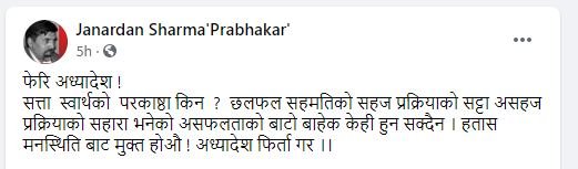 त्यसैगरी सत्तारुढ नेकपाका नेता जनार्दन शर्माले लेखेका छन् , फेरि अध्यादेश ! सत्ता स्वार्थको परकाष्ठा किन ? छलफल सहमतिको सहज प्रक्रियाको सट्टा असहज प्रक्रियाको सहारा भनेको असफलताको बाटो बाहेक केही हुन सक्दैन । हतास मनस्थिति बाट मुक्त होऔ ! अध्यादेश फिर्ता गर ।।’