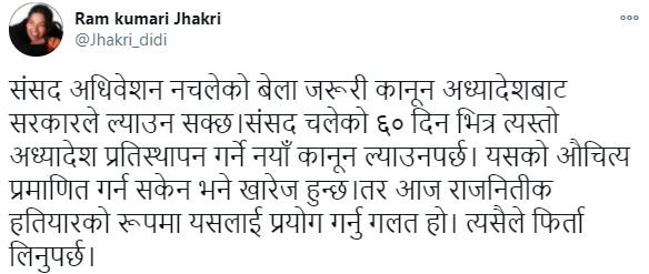 त्यसैगरी नेकपाकी नेतृ रामकुमारी झाँक्रीले लेखेकी छन्, ‘संसद अधिवेशन नचलेको बेला जरूरी कानून अध्यादेशबाट सरकारले ल्याउन सक्छ । संसद चलेको ६० दिन भित्र त्यस्तो अध्यादेश प्रतिस्थापन गर्ने नयाँ कानून ल्याउनपर्छ । यसको औचित्य प्रमाणित गर्न सकेन भने खारेज हुन्छ । तर आज राजनितीक हतियारको रूपमा यसलाई प्रयोग गर्नु गलत हो । त्यसैले फिर्ता लिनुपर्छ।’