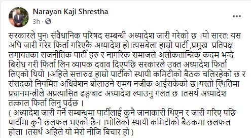 सत्तारुढ नेकपाका प्रवक्ता नारायणकाजी श्रेष्ठले लेखेका छन्,‘सरकारले पुनः संवैधानिक परिषद सम्बन्धी अध्यादेश जारी गरेको छ । यो सारतः यस अघि जारी गरेर फिर्ता गरिएकै अध्यादेश हो।त्यसबेला हाम्रो पार्टी ,प्रमुख प्रतिपक्ष लगायतका राजनीतिक पार्टी हरु र नागरिक समाजले अलोकतान्त्रिक कदम भन्दै बिरोध गरी फिर्ता लिन व्यापक दवाव दिएपछि सरकारले उक्त अध्यादेश फिर्ता लिएको थियो ।अहिले सत्तारुढ हाम्रो पार्टीको स्थायी कमिटीको बैठक चलिरहेको छ र संसदको नियमित अधिवेशन बोलाउने समय नजीक आईसकेको छ।यस्तो स्थितिमा प्रधानमन्त्रीले अप्रत्यासित ढङ्गबाट अध्यादेश ल्याउनु गलत छ । तसर्थ अध्यादेश तत्काल फिर्ता लिनु पर्दछ । ( अध्यादेश जारी गर्ने सम्बन्धमा पार्टीलाई कुनै जानाकारी थिएन र जारी गरिए पछि पार्टीमा कुनै छलफल भएको छैन ।भोलिको स्थायी कमिटीको बैठकमा छलफल होला ।तसर्थ अहिले यो मेरो नीजि बिचार हो )’