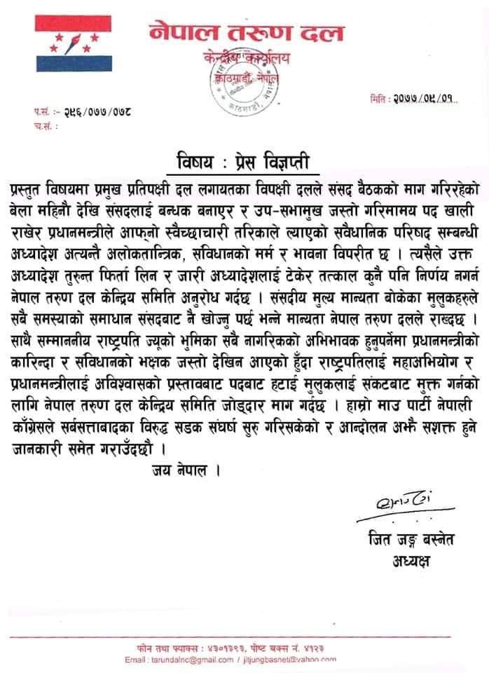 संवैधानिक परिषदसम्बन्धी अध्यादेश तुरुन्त फिर्ता लिन र जारी अध्यादेशमा टेकेर तत्काल कुनै पनि निर्णय नगर्न तरुण दलले अनुरोध गरेको छ । संविधानको मर्म र भावना विपरीत प्रमुख प्रतिपक्षी दल लगायतका विपक्षी दलले संसद बैठकको माग गरिरहेको बेला महिनौदेखि संसदलाई बन्धक बनाएर र उप–सभामुख जस्तो गरिमामय पद खाली राखेर प्रधानमन्त्रीले आफ्नो स्वेच्छाचारी तरिकाले संवैधानिक परिषदसम्बन्धी अध्यादेश ल्याएको भन्दै उक्त अध्यादेश तुरुन्त फिर्ता लिन र जारी अध्यादेशलाई टेकेर तत्काल कुनै पनि निर्णय नगर्न तरुण दलले अनुरोध गरेको छ ।
