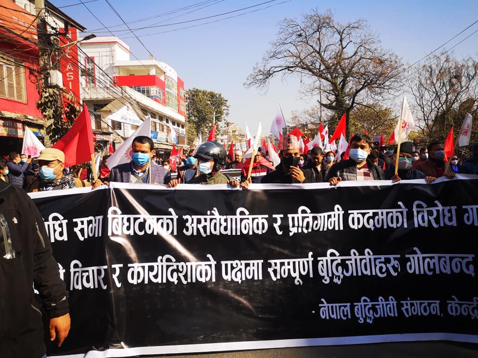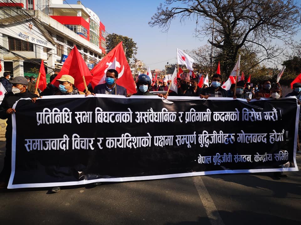 काठमाडौं । नेपाल कम्युनिष्ट पार्टी (नेकपा) दाहाल–नेपाल समूहले प्रतिनिधिसभा विघटनविरुद्ध आज देशव्यापी विरोध प्रदर्शन गरेको छ । यही पुस ७ देखि ९ गतेसम्म बसेको नेकपा केन्द्रीय कमिटी बैठकले आज प्रतिनिधिसभा विघटनविरुद्ध देशव्यापी जनप्रदर्शन गर्ने निर्णय गरेको थियो ।