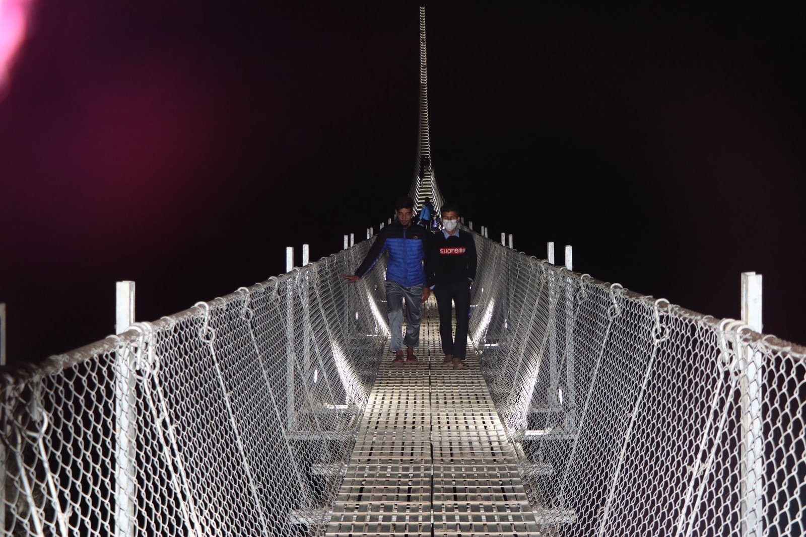 बागलुङको रामरेखा र पर्वतको पाङ जोड्ने एसियाकै लामो दावी गरिएको झोलुङ्गे पुलमा बिजुली बत्ती जोडेपछि रातको समयमा पुल घुम्न पुगेका आन्तरिक पर्यटक । तस्वीर : तारानाथ आचार्य/रासस