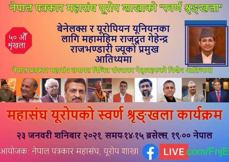 पोर्चुगल । नेपाल पत्रकार महासङ्घ युरोप शाखाले भर्चुअल माध्यमबाट ५०औँ शृङ्खला एक कार्यक्रम आयोजना गरी पत्रकार सम्मान गरेको छ । बेनेलक्सका लागि नेपाली राजदूत गेहेन्द्र राजभण्डारीको प्रमुख आतिथ्यमा भएको कार्यक्रममा केन्द्रका पूर्वअध्यक्षका साथै वैदेशिक शाखाका अध्यक्ष र प्रेस सङ्गठन, प्रेस युनियनका अध्यक्ष, संयोजकलगायत सम्पूर्णलाई सम्मान गरेको थियो ।