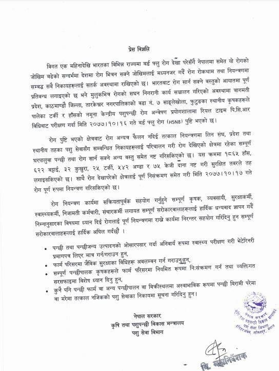 बर्डफ्लू पुष्टि भएपछि त्यो फार्म तथा आसपासमा रहेका १८ सय ५६ वटा हाँस, ६ सय २२ वटा बट्टाई, ३२ वटा कुखुरा, २५ वटा टर्कीसँगै ५ सय ४२ अण्डा र ७५ केजी दाना नष्ट गरिएको विभागले जानकारी दिएको छ ।