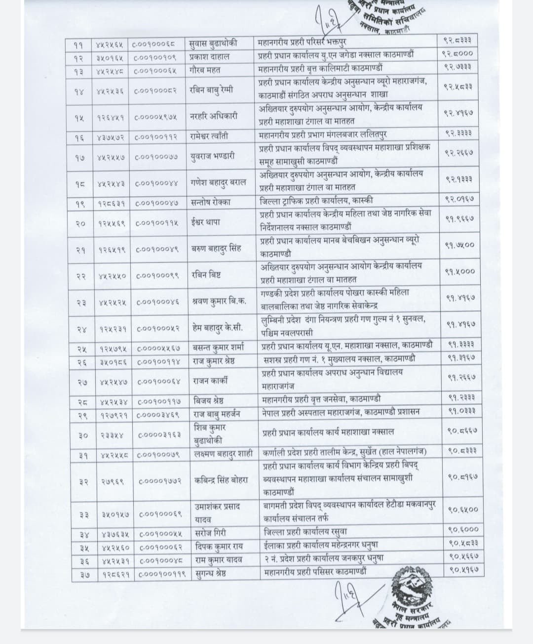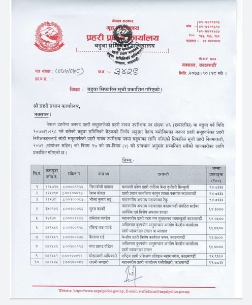 काठमाडौं । नेपाल प्रहरीका ४६ प्रहरी निरीक्षक(इन्स्पेक्टर) डीएसपीमा बढुवाका लागि सिफारिस भएका छन् । आइतबार बसेको बढुवा समितिको बैठकले ४६ जना इन्स्पेक्टरलाई डिएसपीमा बढुवाका सिफारिस गरेको हो ।