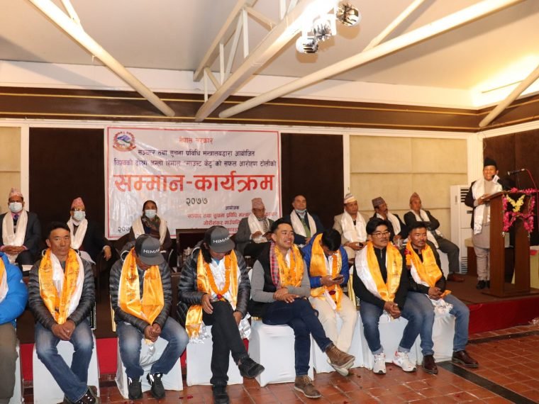 काठमाडौं । सरकारले विश्वको दोस्रो अग्लो हिमाल ‘माउन्ट केटु’ को सफल आरोहण गरी कीर्तिमान कायम गर्ने निर्मल पुर्जा (निम्स) सहित १० आरोहीलाई सम्मान गरेको छ । सञ्चार तथा सूचना प्रविधि मन्त्रालयले सोमबार कीर्तिमानी आरोहीलाई सम्मान गरेको हो ।