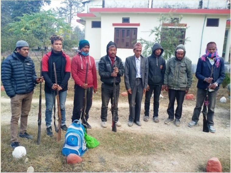 बांके । बांके राष्ट्रिय निकुञ्ज मा संचालित अपरेशन महाहण्ट–७ अन्र्तगत खटिएको नेपाली सेना र निकुञ्जर कार्यालयका कर्मचारी सहितको संयुक्त टोलीले हतियार सहित निकुञ्ज ईलाकाभित्र अवैध जिवजन्तु चोरी शिकारी कार्यमा संलग्न रहेको अभियोगमा सल्यान कालिमाटी गाउंपालिका –३ बस्ने भिमबहादुर खनाललाई पक्राउ गरी थप सोधपुछ गर्ने क्रममा निकुञ्ज सिमावर्ती क्षेत्र वरपर बसोबास गर्ने उनी सहित ९ जना व्यक्तिहरुलाई पक्राउ गरेको छ ।