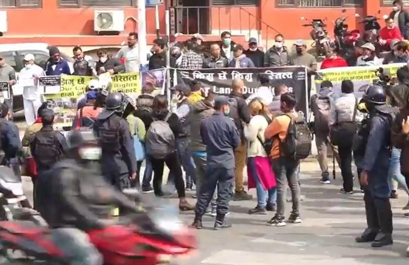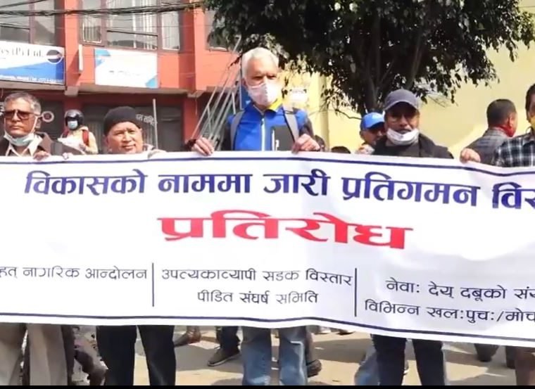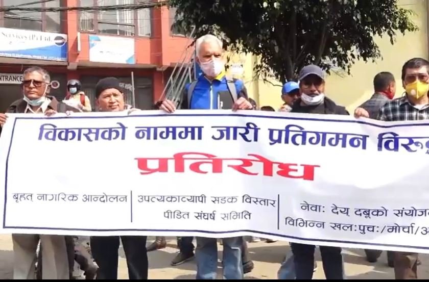 काठमाडौँ । काठमाडौंको माइतीघर मण्डलामा विकासका नाममा जारी प्रतिगमनविरूद्ध प्रदर्शन गरिएको छ । बृहत् नागरिक आन्दोलन,उपत्यकाव्यापी सडक विस्तार पीडित संघर्ष समिति, नेवाः देय् दबूको संयोजनमा विभिन्न खलःपुचःमोर्चा/अभियानले विरोध प्रदर्शन गरेका हुन् ।