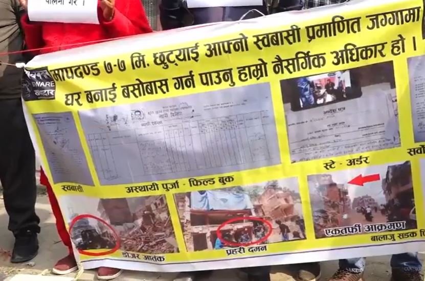 उनीहरूले सुकुम्बासीलाई आदिवासी बनाउन पाइँदैन,कानुनी राज्यको प्रत्याभूत गर, सर्वोच्च आदेशको पालना गर लगायत नारासहितको प्लेकार्ड बोकेर प्रदर्शन गरेका हुन् । सर्वोच्चको आदेशविपरीत स्थानीयकै जग्गामा सूचना केन्द्र बनाउन लागेको भन्दै त्यहाँका ३९ घर परिवारले विरोध गर्दै आएका छन्।