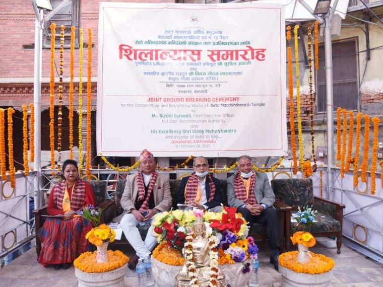 काठमाडौं । मध्य शहरको असनमा अवस्थित सेतो मच्छिन्द्रनाथ मन्दिरको संरक्षण एवं पुनर्निर्माणको काम प्रारम्भ भएको छ । नेपालका लागि भारतीय राजदूत विनयमोहन क्वात्रा, राष्ट्रिय पुनर्निर्माण प्राधिकरणका प्रमुख कार्यकारी अधिकृत सुशील ज्ञवाली तथा काठमाडौँ महानगरपालिकाका प्रमुख विद्यासुन्दर शाक्यले आइतबार संयुक्तरूपमा भूमिपूजा गरेर पुनर्निर्माण एवं पुनःस्थापनाको शुभारम्भ गरे ।
