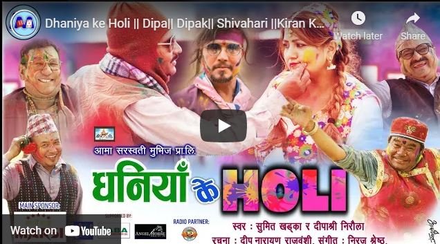 चलचित्र निर्देशक एवं नायिक दीपाश्री निरौलाको ‘धनिया के होली’ बोलको गीत सार्वजनिक भएको छ । गीतमा दीपाश्री र सुमित खड्काको स्वर रहेको छ । शब्द रचना पनि दीपा स्वयंको रहेको गीतमा संगीत निरज श्रेष्ठले भरेका छन् ।