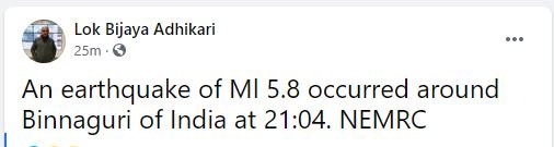 काठमाडौं । भारतमा सोमबार राति ५.८ म्याग्निच्यूडको भूकम्प गएको छ । राष्ट्रिय भूकम्प मापन केन्द्रले राति ९ बजेर ४ मिनेट जाँदा भारतको बिन्नागुरीलाई केन्द्रबिन्दु बनाएर भूकम्प गएको बताएको छ । बिन्नागुरी भारत र भुटानको सीमाक्षेत्र भएको बताइएको छ । पूर्वी नेपालमा कडा र काठमाडौंमा भूकम्पको धक्काको हल्का महसुस गरिएको थियो ।
