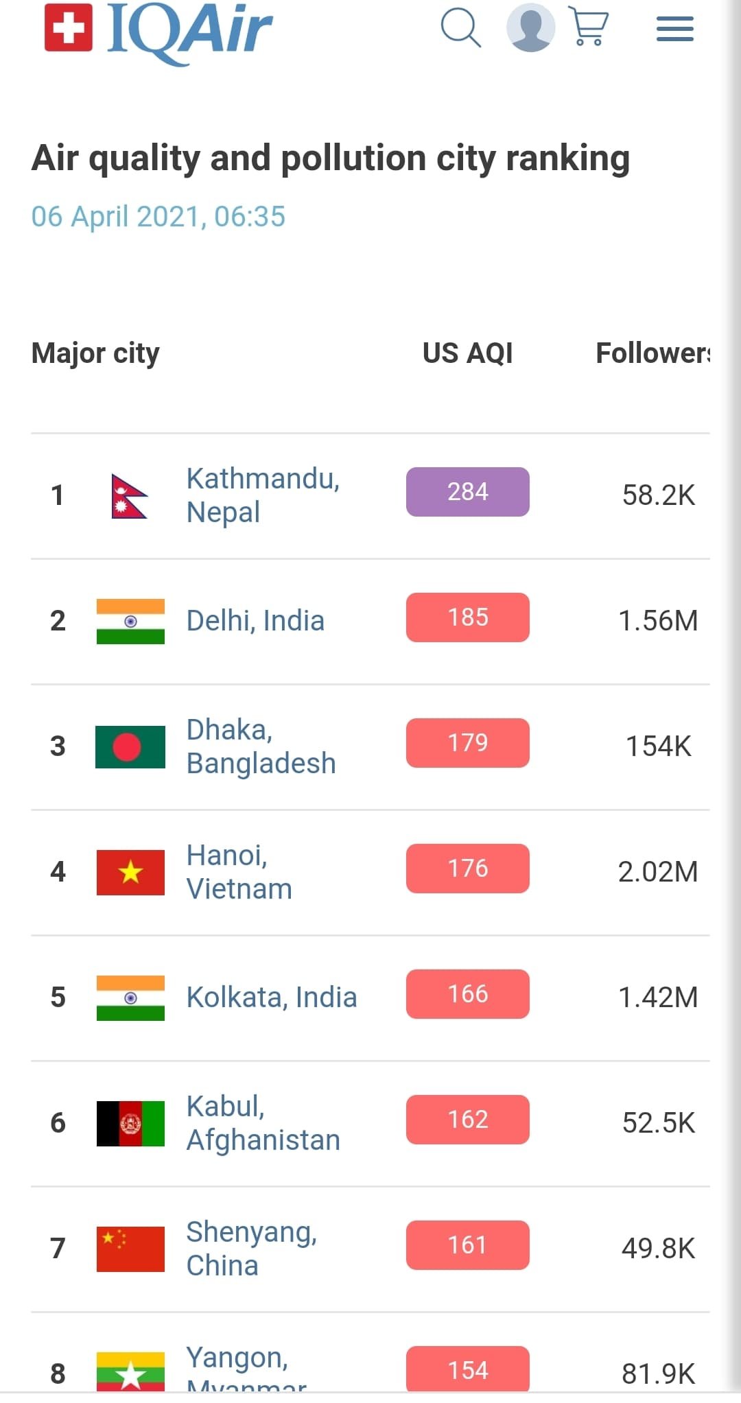 आज बिहान काठमाडौंको क्युआई २८४ रहेको छ । मंगलबार बिहान काठमाडौंपछि बंगलादेशको ढाका, भारतको दिल्ली, भियतनामको हानोइ क्रमशः दोस्रो, तेस्रो स्थानमा रहेका छन् । देशका विभिन्न स्थानमा लागेको डढेलो तथा लामो समयदेखि पानी नपर्दा प्रदूषण बढेको हो ।