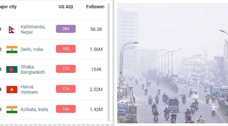 काठमाडौं । काठमाडौं मंगलबार पनि विश्वकै प्रदूषित सहरको सूचीमा एक नम्बरमा परेको छ । सोमबार पनि पहिलो नम्बरमा रहेको काठमाडौं आजपनि एक नम्बरमै परेको हो ।