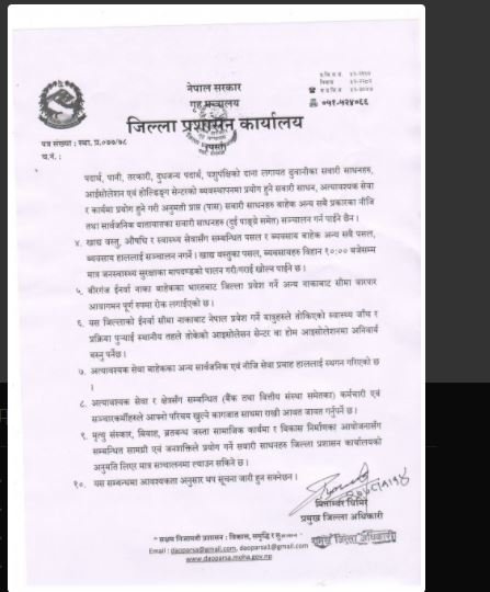 कोरोना संक्रमणको दर तीव्र गतिले बढेपछि यसको रोकथामका लागि निषेधाज्ञा जारी गर्ने निर्णय भएको प्रशासनले जनाएको छ ।