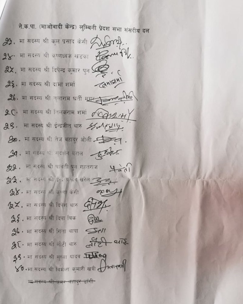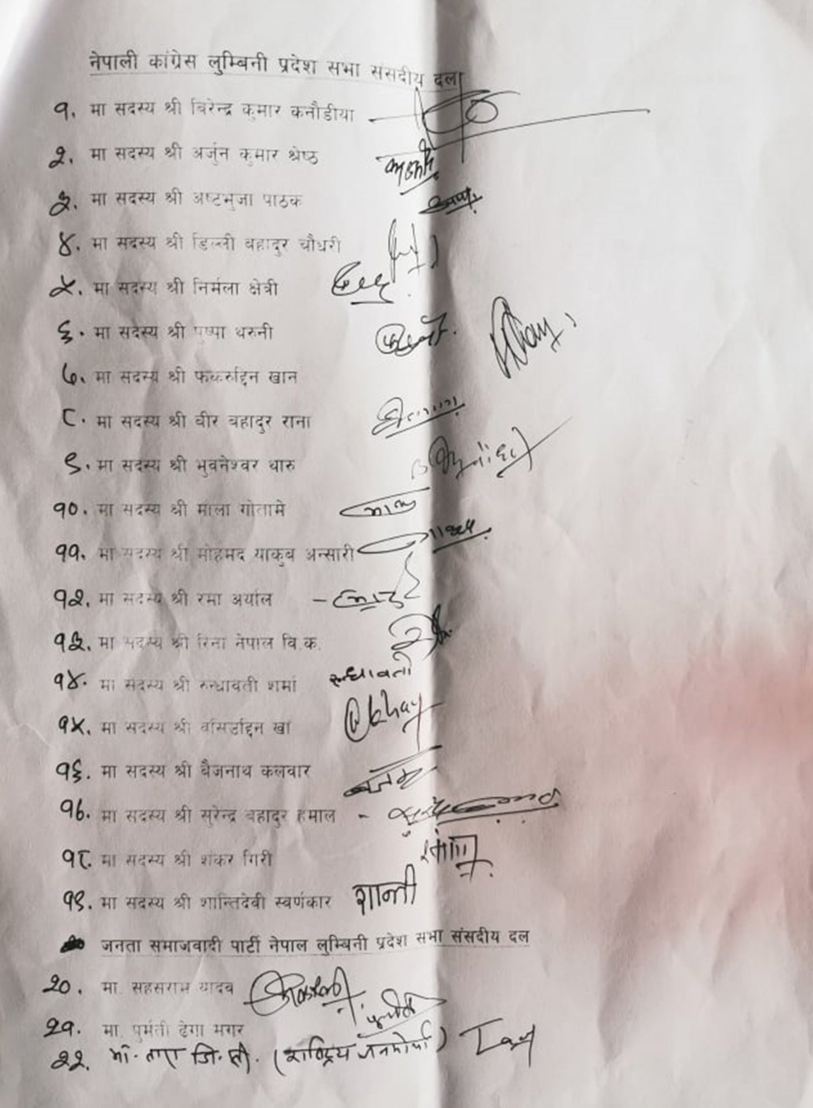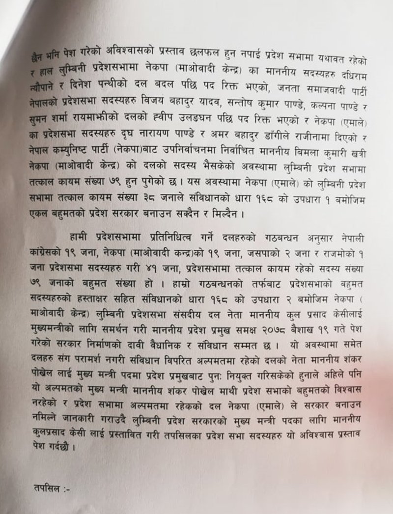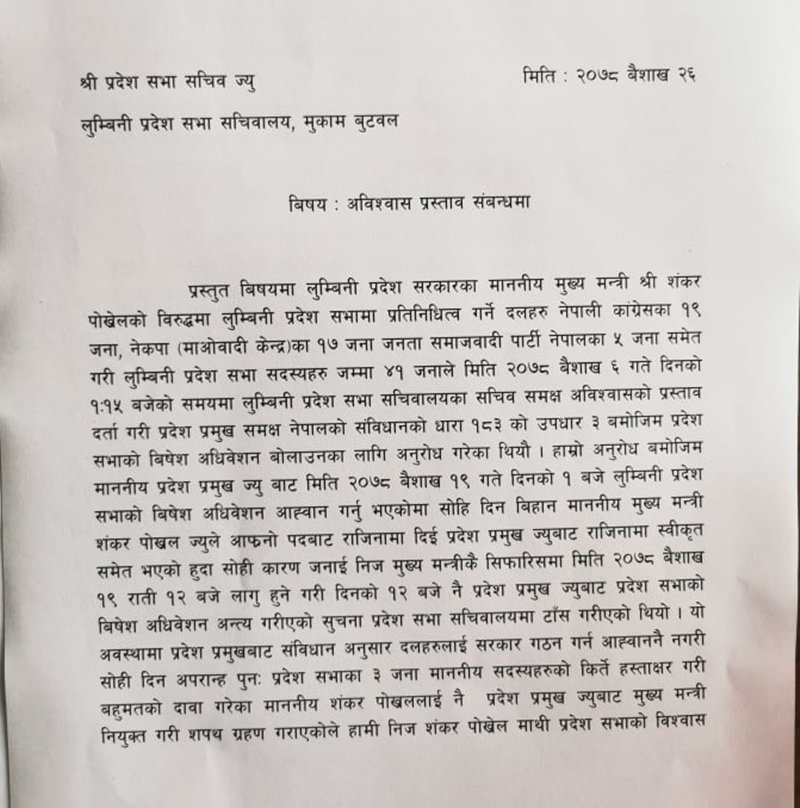 आइतबार ४० सांसदको हस्ताक्षरसहित मुख्यमन्त्रीविरुद्ध प्रदेशसभा सचिवालयमा अविश्वास प्रस्ताव दर्ता गरिएको नेपाली काँग्रेसका सचेतक फखरुदीन खानले जानकारी दिएका छन् ।