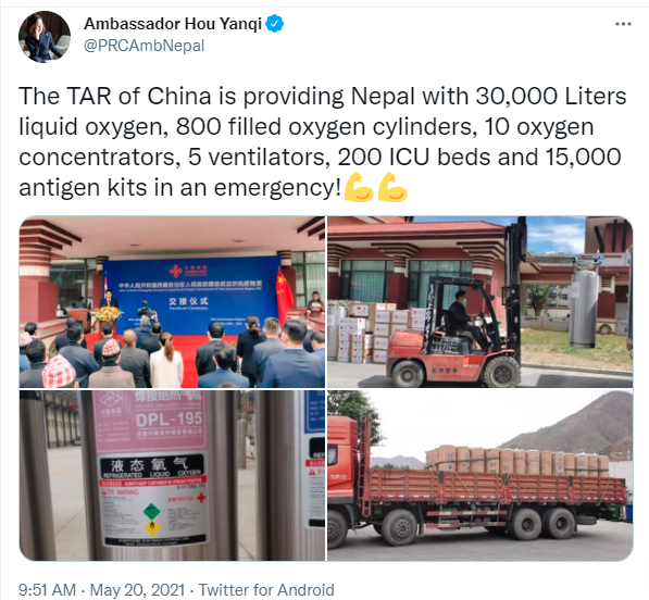 नेपाली नियोगकै अनुरोधमा शान श्रीस्थित एक कम्पनीले उपलब्ध गराएको ३० थान अक्सिजन कन्सन्ट्रेटर पनि भोलि नै ल्हासाबाट काठमाडौँतर्फ पठाउने तयारी भइरहेको छ । ल्हासाबाट काठमाडौँसम्मको ढुवानीको व्यवस्थापन सिल्क ट्रान्सपोर्टले निःशुल्क गरिदिने भएको छ । त्यसैगरी तिब्बत गुडवील फाउण्डेसनले अर्काे हप्ता ५० वटा कन्सन्ट्रेटर उपलब्ध गराउने बताइएकाे छ ।