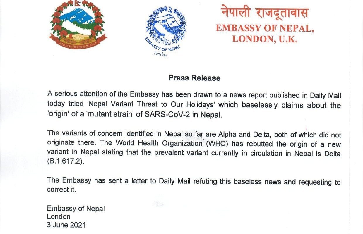 समाचार आधारहीन रहेको र नेपालमा अहिलेसम्म अल्फा (बी.१.१.७), डेल्टा (बी.१.७१२.२) भेरियन्ट फेला परेका छन् । यी दुवैको उत्पत्ति नेपालमा नभएको र विश्व स्वास्थ्य सङ्गठन (डब्लुएचओ)ले पनि नेपालमा नयाँ संस्करणको भेरियन्ट उत्पत्ति भएको भन्ने समाचारको खण्डन गरिरहेको राजदूतावासले जारी गरेको विज्ञप्तिमा भनिएको छ ।