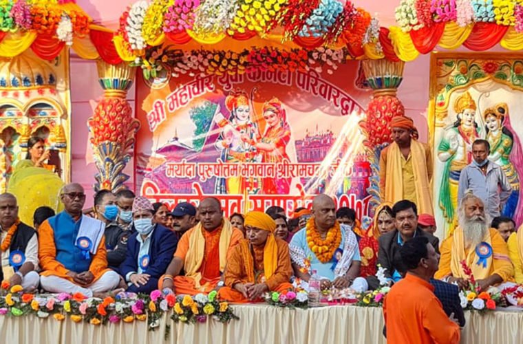 सप्ताहव्यापी रुपमा जनकपुरधाममा सुरु भएको विवाहपञ्चमी महोत्सव अन्तर्गत सोमबार चौथो दिन जानकी मन्दिरका छोटे महन्थ रामरोशन दास, अयोध्या दरबारको प्रतिनिधित्व गर्ने जनकपुरधाम स्थित राम मन्दिरका महन्थ राम गिरी लगायत राम मन्दिरमा तिलकोत्सव समारोहमा सहभागी हुँदै ।