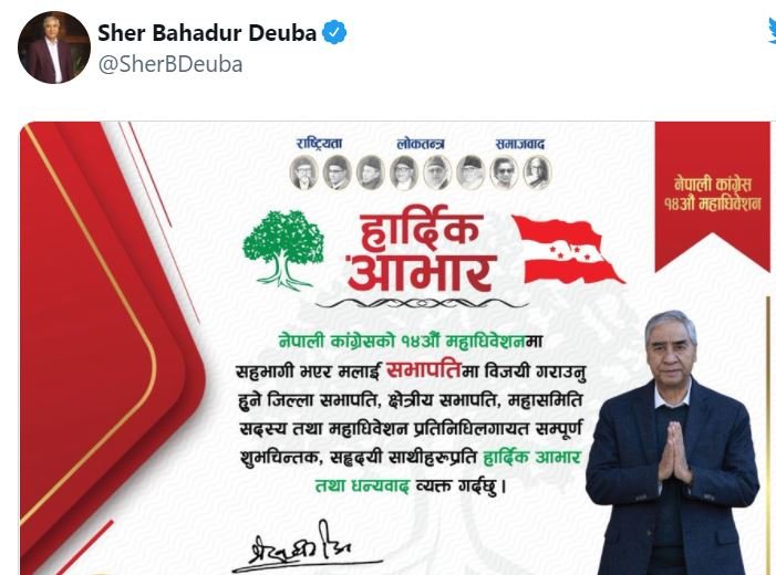 ‘नेपाली कांग्रेसको १४ औं महाधिवेशनमा सहभागी भएर मलाई सभापतिमा विजयी गराउनु हुने जिल्ला सभापति, क्षेत्रीय सभापति, महासमिति सदस्य तथा महाधिवेशन प्रतिनिधिलगायत सम्पूर्ण शुभचिन्तक, सहृदयी साथीहरुप्रति हार्दिक आभार तथा धन्यवाद व्यक्त गर्दछु,’ प्रधानमन्त्रीले ट्विटमा उल्लेख गरेका छन् ।