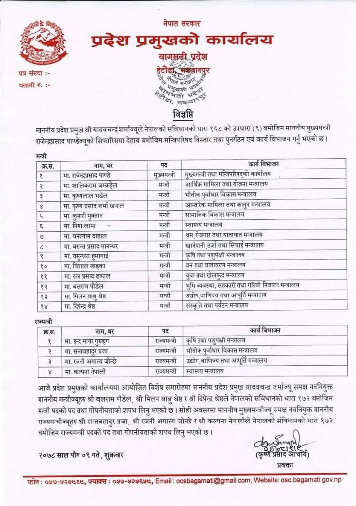 यससँगै बागमती प्रदेशमा मुख्यमन्त्री तथा मन्त्रिपरिषद्को कार्यालयसहित १४ वटै मन्त्रालयले पूर्णता पाएको छ । नवनियुक्त मन्त्री र राज्यमन्त्रीहरुको आजै सपथ हुने मुख्यमन्त्री तथा मन्त्रिपरिषद्को कार्यालयले जनाएको छ ।