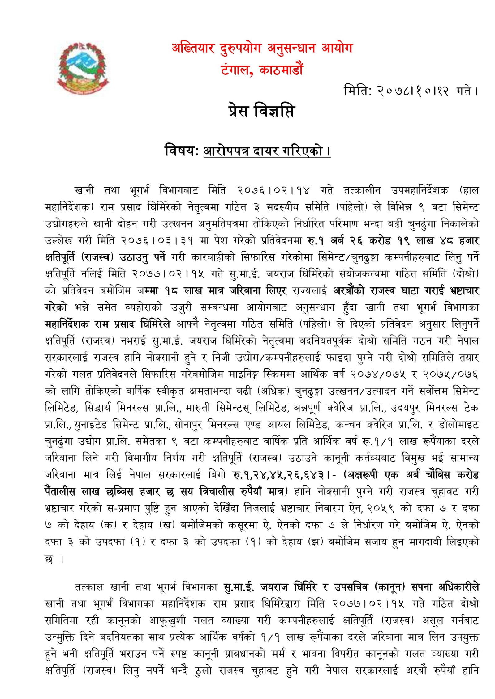 काठमाडौं । अख्तियार दुरूपयोग अनुसन्धान आयोगले खानी तथा भूगर्भ विभागका महानिर्देशक रामप्रसाद घिमिरेसहित १८ जनाविरूद्ध विशेष अदालतमा भ्रष्टाचार मुद्दा दायर भएको छ । एक अर्ब २४ करोड ४५ लाख २६ हजार ६४३ रुपैयाँ बराबरको राजश्व चुहावट गरेर भ्रष्टाचार गरेको आरोपमा घिमिरेसहित १८ जनाविरुद्ध आयोगले बुधबार मुद्दा दायर गरेको हो ।